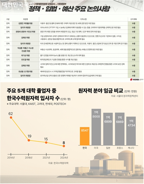 ±¹È¸ ±âȹÀçÁ¤À§¿øÈ¸ 2025³âµµ ±¹Á¤°¨»ç¿¡¼ ¿©¾ß ÀÇ¿øµéÀÌ ÇѸñ¼Ò¸®·Î ¡°¿øÀÚ·Â ÀÎÀç È®º¸¿Í ó¿ì °³¼±Àº ±¹°¡°æÀï·ÂÀÇ ÇÙ½É °úÁ¦¡±¶ó¸ç Á¤ºÎÀÇ Àû±Ø ´ëÀÀÀ» Ã˱¸Çß´Ù. ÀÌ´Â Çѱ¹¼ö·Â¿øÀڷ³ëÁ¶(À§¿øÀå °Ã¢È£)°¡ ²ÙÁØÈ÷ Á¦±âÇØ¿Â ¡®¿£Áö´Ï¾î ´Ü°¡ Çö½ÇÈ¡¯ ¿ä±¸°¡ ±¹È¸ Â÷¿ø¿¡¼ °ø°¨´ë¸¦ ¾òÀº °á°ú·Î Æò°¡µÈ´Ù.