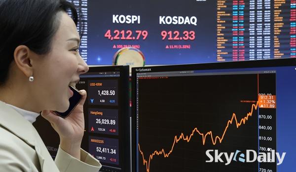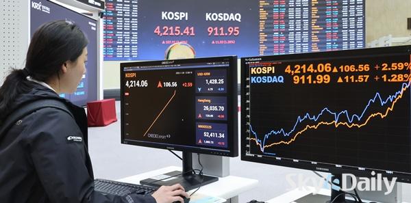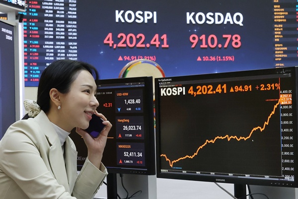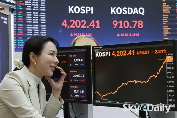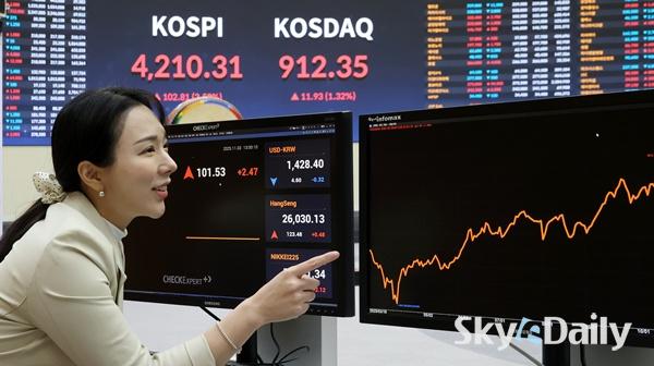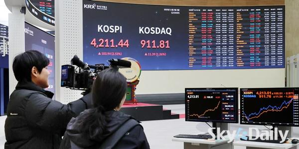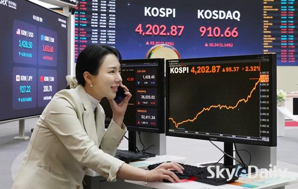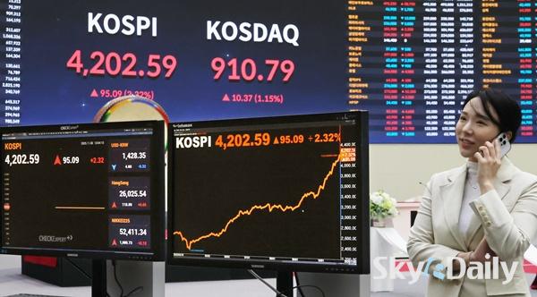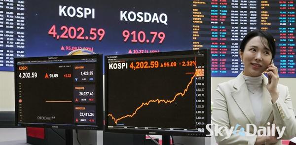 ¡ã ÄÚ½ºÇÇ Áö¼ö°¡ »ç»ó ÃÖÃÊ 4200À» µ¹ÆÄÇÑ 3ÀÏ ¼­¿ï ¿©Àǵµ Çѱ¹°Å·¡¼Ò Àü±¤ÆÇ¿¡ ÄÚ½ºÇÇ Áö¼ö°¡ Ç¥½ÃµÇ¾î ÀÖ´Ù. À̳¯ ÄÚ½ºÇÇ Áö¼ö´Â Àü °Å·¡ÀÏ ´ëºñ 114.37Æ÷ÀÎÆ®(2.78%) ¿À¸¥ 4221.87·Î ÀåÀ» ¸¶ÃÆ´Ù. APEC Á¤»óȸÀǸ¦ °è±â·Î ¿­¸° ÇÑ¹Ì Á¤»óȸ´ã¿¡¼­ °ü¼¼ Çù»ó ÈÄ¼Ó ÇùÀÇÀÇ ¸¶¹«¸® ¼Ò½Ä°ú ¹Ì¡¤Áß Á¤»óȸ´ã¿¡¼­ ¹«¿ªÀüÀï È®Àü ÀÚÁ¦ ÇÕÀÇ¿¡ ÈûÀÔÀº °ÍÀ¸·Î ÇØ¼®µÈ´Ù. ÀÌÁ¾¿ø ±âÀÚ ¨Ï½ºÄ«À̵¥Àϸ®