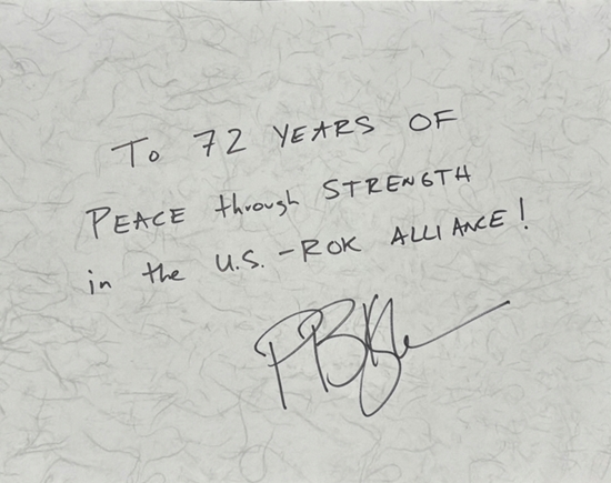 Çì±×¼¼½º Àå°üÀº ÀÌ¾î ±¹¹æºÎ 3Ãþ Àü½Ã½Ç¿¡ ¸¶·ÃµÈ ¹æ¸í·Ï¿¡ ¡°To 72 years of peace through strength in the U.S.-ROK alliance!¡±(ÈûÀ» ÅëÇÑ ÆòÈ­, Çѹ̵¿¸Í 72³âÀ» ±â¸®¸ç) ¶ó´Â ¹®±¸¸¦ ³²°å´Ù. ¼­¸í ÈÄ¿¡´Â ¡°We go together(¿ì¸®´Â ÇÔ²² °£´Ù)¡±¶ó°í ¸»ÇÏ¸ç ¾È Àå°ü°ú ±â³ä ÃÔ¿µÀ» ¸¶Ä£ µÚ ȸÀÇÀåÀ¸·Î À̵¿Çß´Ù.