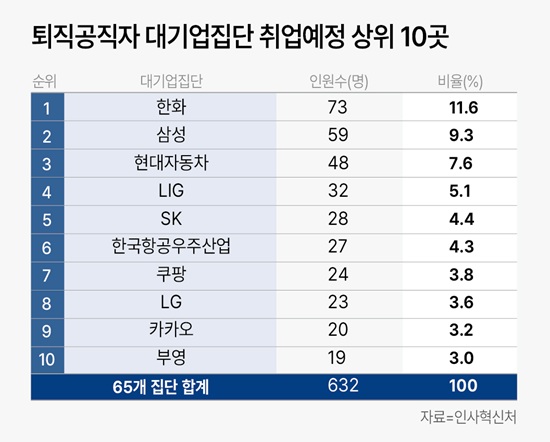 ´ë±â¾÷Áý´Ü(65°³ ±×·ì 632¸í) Áß¿¡¼´Â ÇÑȱ׷ìÀÌ 11.6%(73¸í)·Î °¡Àå ¸¹¾Ò´Ù. ´ÙÀ½À¸·Î »ï¼º(9.3%, 59¸í), Çö´ëÀÚµ¿Â÷(7.6%, 48¸í), LIG(5.1%, 32¸í), SK(4.4%, 28¸í) ¼øÀ̾ú´Ù. Çѱ¹Ç×°ø¿ìÁÖ»ê¾÷(4.3%, 27¸í), ÄíÆÎ(3.8%, 24¸í), LG(3.6%, 23¸í), īī¿À(3.2%, 20¸í), ºÎ¿µ(3.0%, 19¸í) µîÀÌ µÚ¸¦ À̾ú´Ù. À̵é 10°÷ÀÌ Àüü ´ë±â¾÷Áý´Ü Ãë¾÷ÀÚÀÇ Àý¹Ý ÀÌ»ó(353¸í)À» Â÷ÁöÇß´Ù.