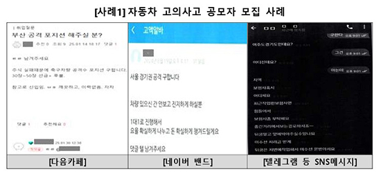 ±Ý°¨¿ø¿¡ µû¸£¸é ¿Â¶óÀÎ Ä¿¹Â´ÏƼ¿Í ¸Þ½ÅÀú¸¦ ÅëÇÑ ½ÅÁ¾ ¼ö¹ýÀÌ È®ÀεƴÙ. ù°, ÀÚµ¿Â÷ °íÀÇ»ç°í °ø¸ðÇüÀÌ´Ù. A¡¤BÀÇ °æ¿ìó·³ °¡ÇØÀÚ¡¤ÇÇÇØÀÚ·Î ¿ªÇҺдã ÇØ Á¢ÃË»ç°í¸¦ ³»°í º¸Çè±ÝÀ» ³ª´©´Â À¯ÇüÀ¸·Î, »ç°í ´Ù¹ß ±³Â÷·Î¸¦ ÅÃÇϰųª Áø·Îº¯°æ Â÷·®¿¡ °íÀÇ·Î µéÀ̹޴ ¹æ½ÄÀÌ µ¿¿øµÈ´Ù. ºí·¢¹Ú½º ¿µ»ó°ú Æó¼âȸ·Î(CC)TV, »ç°íÀÌ·Â Á¶È¸·Î °íÀǼº Á¤È²ÀÌ µå·¯³ª¸é °ø¹ü ¸ðµÎ°¡ ¼ö»ç ´ë»óÀÌ µÈ´Ù.