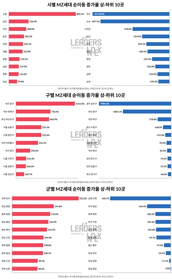 Á¦ÁÖ´Â ÆÒµ¥¹Í ÀÌÀü MZ¼¼´ë ¼øÀ¯ÀÔ Áö¿ªÀ̾úÀ¸³ª ÀÌÈÄ 6018¸í °¨¼Ò·Î ±Þ¹ÝÀüµÇ¸ç Àü±¹ ÃÖ´ë °¨¼ÒÀ²À» ±â·ÏÇß´Ù. ½Ã¡¤±º¡¤±¸ ´ÜÀ§¿¡¼´Â °ÝÂ÷°¡ ´õ¿í ¶Ñ·ÇÇß´Ù. ¼ö¿ø¡¤´çÁø¡¤¾Æ»ê¡¤¾çÁÖ¡¤¾È¾ç µîÀº MZ Áõ°¡À² »óÀ§±Ç¿¡ ¿Ã¶ú´Ù. ¹Ý¸é, ÀüÁÖ¡¤¼ÓÃÊ¡¤¼±ÍÆ÷¡¤¼»ê¡¤ÁøÁÖ µîÀº ÀÌÅ»ÀÌ ±ÞÁõÇß´Ù. ±âÃÊ´Üü ±âÁØÀ¸·Î´Â ´ë±¸ Áß±¸, ºÎ»ê ¿¬Á¦¡¤ºÎ»êÁø, ¼¿ï ¼ºµ¿¡¤±¤Áø±¸ µîÀÌ ±ÞÁõ Áö¿ªÀÌ´Ù. ÀÌ¿¡ ±¤ÁÖ ±¤»ê¡¤ºÎ»ê Áß±¸¡¤°¿ø ÀÎÁ¦±º µîÀº ±Þ°¨ Áö¿ªÀ¸·Î ºÐ·ùµÆ´Ù.