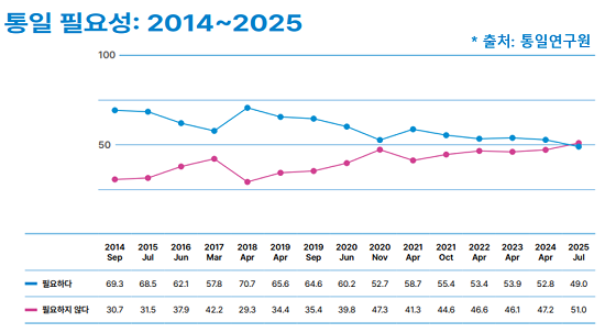 ÅëÀÏ Çʿ伺¿¡ ´ëÇÑ ÀνÄÀÌ 49%·Î ¿ª´ë ÃÖÀú¸¦ ±â·ÏÇÑ Ã¤ 2025³âÀ» ¸¶¹«¸®ÇÑ´Ù. ÅëÀÏ¿¬±¸¿øÀÌ Áö³­ 10¿ù ¹ßÇ¥ÇÑ Á¶»ç °á°ú´Ù. ±èÁ¤ÀºÀÌ ³²ºÏÀ» ¡¯Àû´ëÀû µÎ ±¹°¡¡® °ü°è¶ó°í ÇßÀ¸´Ï ¿ì¸®¸¸ ÅëÀÏ ¾ê±âÇϱⰡ ¸Ó¾³ÇÏ´Ï±î ±×·± °á°ú°¡ ³ª¿Ô´Ù°í º»´Ù.
