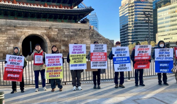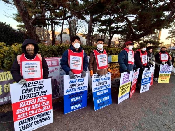 ¡ã ¹ÎÁÖ³ëÃÑ °ø°ø¿î¼ö³ëÁ¶ ¼­¿ïÁö¿ª°ø°ø¼­ºñ½ºÁöºÎ û¿Í´ëºÐȸ°¡ 22ÀÏ ¿ÀÀü ¼­¿ï ¿ë»ê±¸ ´ëÅë·É½Ç ¾Õ¿¡¼­ Áýȸ¸¦ ¿­°í 'ÂѰܳª´Â û¿Í´ë ¿ë¿ª ¾È³»¡¤º¸¾È ³ëµ¿ÀÚ °í¿ëÀ» º¸ÀåÇ϶ó' µî ¹®±¸°¡ ÀûÈù ÇÇÄÏÀ» µé°í û¿Í´ë »ç¶ûä±îÁö ÇàÁøÇϰí ÀÖ´Ù. °ø°ø¿î¼ö³ëÁ¶ ¼­¿ïÁöºÎ