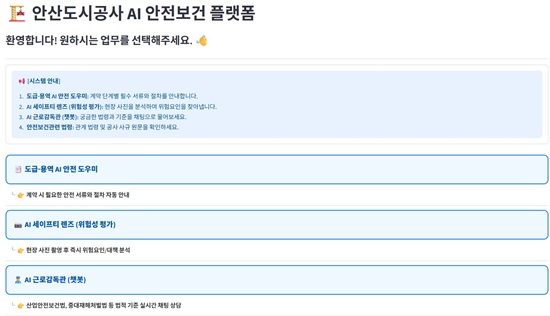 ¿ì¼± ¡®AI ¾ÈÀü µµ¿ì¹Ì¡¯´Â µµ±Þ¡¤¿ë¿ª °è¾àÀÇ ´Ü°èº° Çʼö ¼­·ù¿Í ÀýÂ÷¸¦ ÀÚµ¿ ¾È³»ÇØ ÇàÁ¤ ´©¶ôÀ» ¹æÁöÇÑ´Ù. ÀÌ¿Í ÇÔ²² ¡âÇöÀå »çÁøÀ» ºÐ¼®ÇØ ÀáÀç À§Çè¿äÀÎÀ» µµÃâÇÏ´Â ¡®AI ¼¼ÀÌÇÁƼ ·»Áî(À§Ç輺 Æò°¡)¡¯ ¡â¾ÈÀüº¸°Ç °ü·Ã ¹ý·ÉÀ» ±â¹ÝÀ¸·Î ÁúÀÇÀÀ´äÀ» Á¦°øÇÏ´Â ¡®AI ±Ù·Î°¨µ¶°ü(꺿)¡¯ ¡â°ü·Ã ¹ý·É Á¶È¸ ±â´É µîÀ¸·Î ±¸¼ºµÆ´Ù.