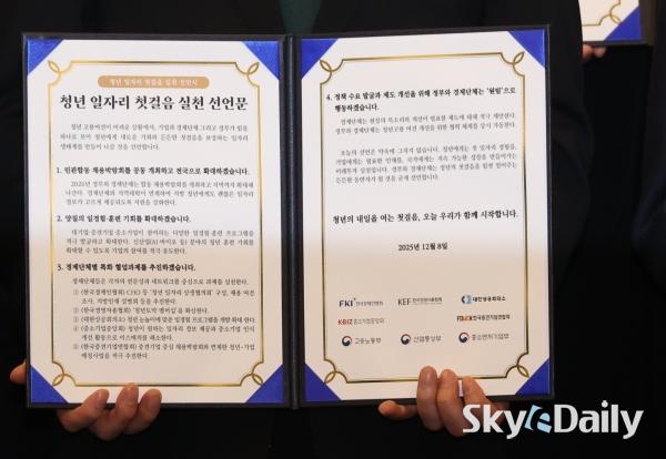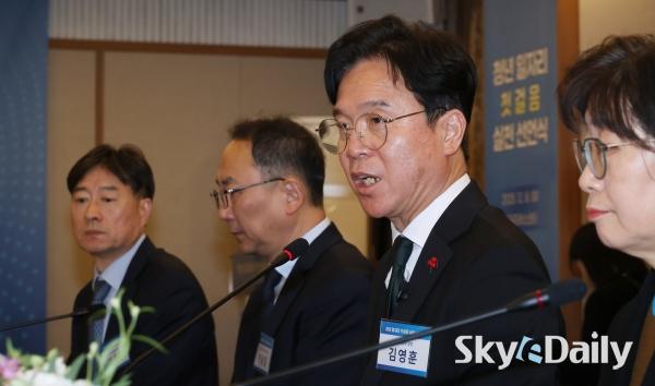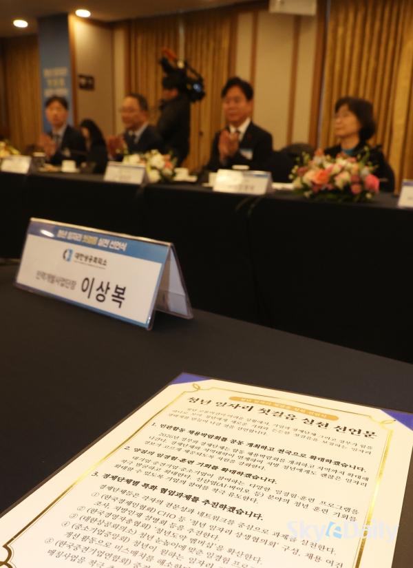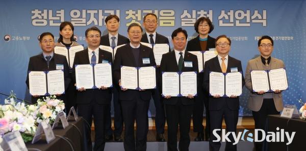 ¡ã Ãֱ٠û³â ½Ç¾÷·üÀÌ Áõ°¡µÇ°í ÀÖ´Â °¡¿îµ¥ ±è¿µÈÆ °í¿ë³ëµ¿ºÎ Àå°üÀ» ºñ·ÔÇÑ Âü¼®ÀÚµéÀÌ 8ÀÏ ¼­¿ï Áß±¸ ÇÁ·¹½º¼¾ÅÍ¿¡¼­ ¿­¸° ¡®Ã»³â ÀÏÀÚ¸® ù°ÉÀ½ ½Çõ ¼±¾ð½Ä¡¯ ¿¡¼­ ±â³äÃÔ¿µÀ» Çϰí ÀÖ´Ù. À̳¯ ¼±¾ð½Ä¿¡´Â ±è Àå°ü, ±èâ¹ü Çѱ¹°æÁ¦ÀÎÇùȸ »ó±ÙºÎȸÀå, À̵¿±Ù Çѱ¹°æ¿µÀÚÃÑÇùȸ »ó±ÙºÎȸÀå, ÀÌ»óº¹ ´ëÇÑ»ó°øÈ¸ÀÇ¼Ò Àη°³¹ß»ç¾÷´ÜÀå, ¿À±â¿õ Áß¼Ò±â¾÷Áß¾Óȸ »ó±ÙºÎȸÀå, ÀÌÈ£ÁØ Çѱ¹Áß°ß±â¾÷¿¬ÇÕȸ »ó±ÙºÎȸÀåÀÌ Âü¼®Çß´Ù.  ¹Ú¹Ì³ª ±âÀÚ ¨Ï½ºÄ«À̵¥Àϸ®