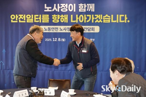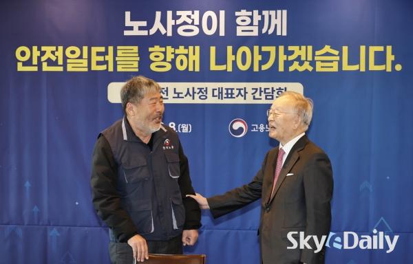 ¡ã ±è¿µÈÆ(¿À¸¥ÂÊ) °í¿ë³ëµ¿ºÎ Àå°üÀÌ ±èµ¿¸í Çѱ¹³ëµ¿Á¶ÇÕÃÑ¿¬¸Í À§¿øÀå°ú ¾Ç¼öÇϰí ÀÖ´Ù.