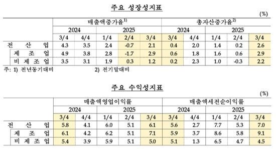 Çѱ¹ÀºÇàÀÌ 17ÀÏ ¹ßÇ¥ÇÑ ¡®2025³â 3ºÐ±â ±â¾÷°æ¿µºÐ¼®¡¯¿¡ µû¸£¸é ¿Ü°¨±â¾÷ÀÇ ¸ÅÃâ ¼ºÀ强°ú ¼öÀͼºÀÌ ÀüºÐ±â ¹× Àü³âµ¿±â ´ëºñ ¸ðµÎ °³¼±µÆ´Ù. ¸ÅÃâ¾×Áõ°¡À²Àº 2.1%·Î Á÷Àü ºÐ±â -0.7%¿¡¼­ Ç÷¯½º·Î ÀüȯµÆ´Ù. ÃÑÀÚ»êÁõ°¡À²µµ ÀüºÐ±â 0.2%, Àü³âµ¿±â 0.4%¿¡¼­ 2.6%·Î »ó½ÂÆøÀ» Ű¿ü´Ù.