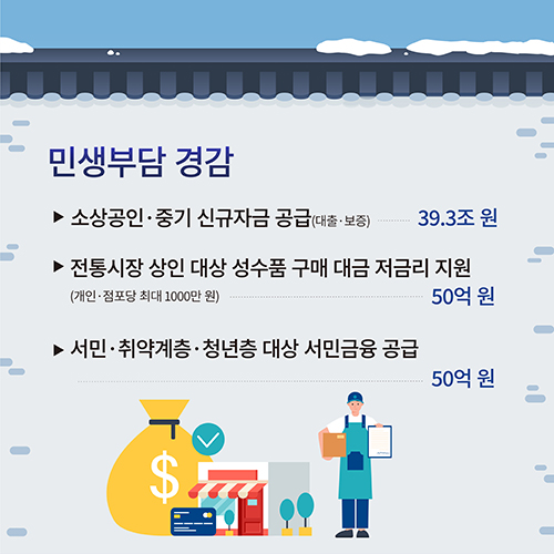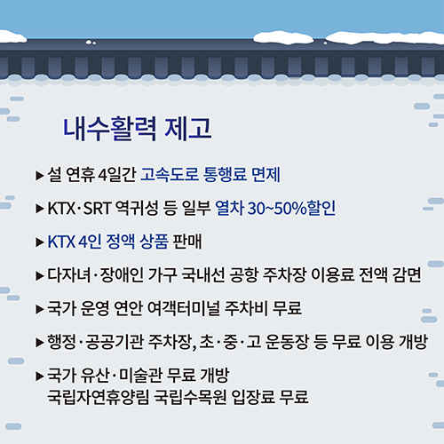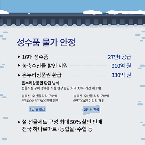 Á¤ºÎ°¡ ¼³ ¸íÀýÀ» ¾ÕµÎ°í ¹°°¡ ¾ÈÁ¤°ú ³»¼ö Ȱ¼ºÈ­¸¦ À§ÇÑ ¡®¼³ ¹Î»ý¾ÈÁ¤ ´ëÃ¥¡¯À» ³»³ù´Ù. 16´ë ¼º¼öǰÀº ÃÖ´ë 50% ÇÒÀÎ Áö¿øÇϰí, ¼öÀÔ °úÀÏ¡¤»ý¼±¿¡´Â ÇÒ´ç°ü¼¼¸¦ Àû¿ëÇÑ´Ù. ¼Ò»ó°øÀΡ¤Áß¼Ò±â¾÷¿¡ 39Á¶¿ø´ë ÀÚ±ÝÀ» °ø±ÞÇÏ°í »ý°è±Þ¿©´Â ¼³ Àü Á¶±â Áö±ÞÇÑ´Ù. 5ÀÏ È²±Ý¿¬ÈÞ µ¿¾È °í¼Óµµ·Î ÅëÇà·á¸¦ ¸éÁ¦Çϰí, °ü±¤¡¤¼Òºñ ÃËÁø ´ëÃ¥µµ º´ÇàÇÑ´Ù.