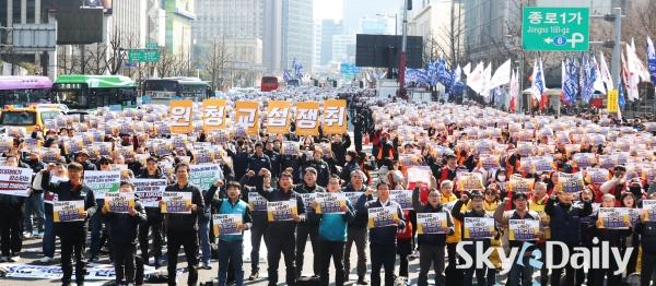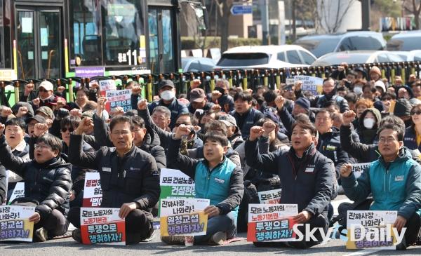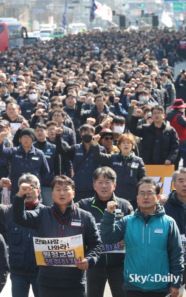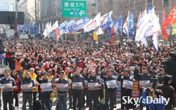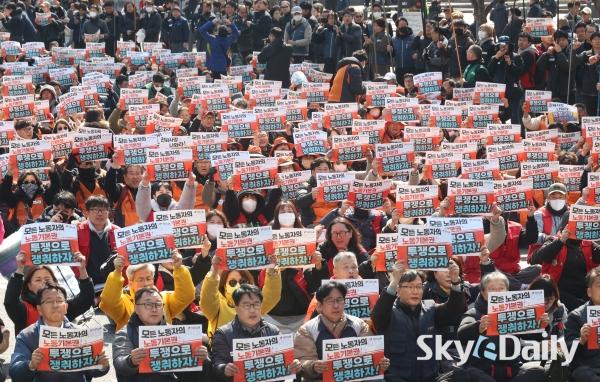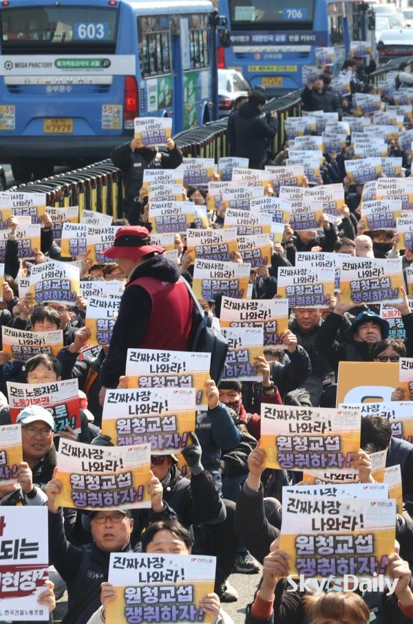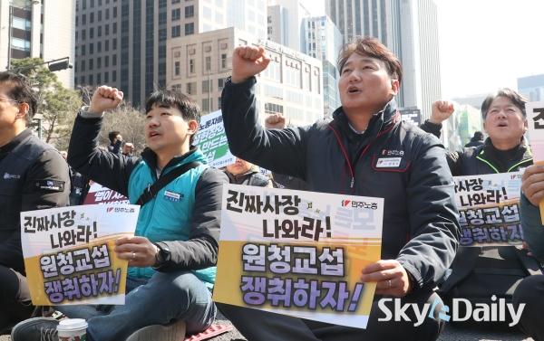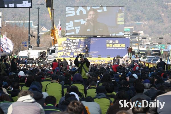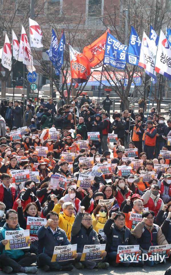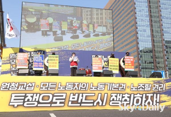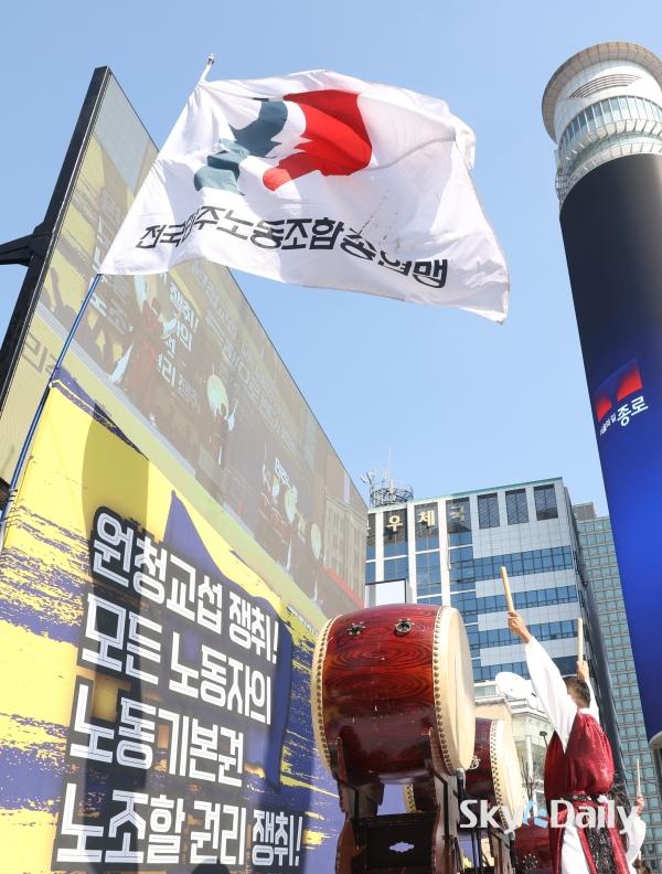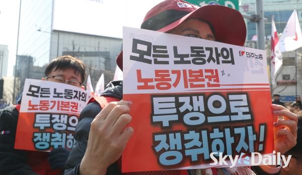¡ã ¡®³ë¶õºÀÅõ¹ý¡¯(³ëµ¿Á¶ÇÕ ¹× ³ëµ¿°ü°èÁ¶Á¤¹ý 2¡¤3Á¶ °³Á¤ ¹ý·ü) ½ÃÇà ù³¯ÀÎ 10ÀÏ ¿ÀÈÄ ¹ÎÁÖ³ëÃÑ Á¶ÇÕ¿øµéÀÌ ¼¿ï Á¾·Î±¸ ¼¼Á¾´ë·Î ÀÏ´ë¿¡¼ ¿¸° ¹ÎÁÖ³ëÃÑ ÅõÀï ¼±Æ÷´ëȸ¿¡¼ ±¸È£¸¦ ¿ÜÄ¡°í ÀÖ´Ù. ÇÏû ³ëµ¿ÀÚ°¡ ¿øÃ» ±â¾÷°ú Á÷Á¢ ±³¼·ÇÒ ¼ö ÀÖ´Â ¡®³ë¶õºÀÅõ¹ý¡¯ ÀÌ 10ÀϺÎÅÍ ½ÃÇàµÇ¸é¼ ³ëµ¿°è°¡ ¿øÃ» ±â¾÷À» »ó´ë·Î ÇÑ ±³¼· ¿ä±¸¿¡ º»°ÝÀûÀ¸·Î ³ª¼¹´Ù. ¹Ú¹Ì³ª ±âÀÚ ¨Ï½ºÄ«À̵¥Àϸ®