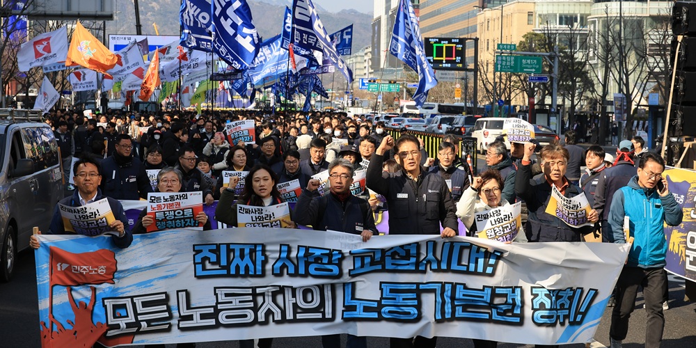 ¡ã ¡®³ë¶õºÀÅõ¹ý¡¯(³ëµ¿Á¶ÇÕ ¹× ³ëµ¿°ü°èÁ¶Á¤¹ý 2¡¤3Á¶ °³Á¤ ¹ý·ü) ½ÃÇà ù³¯ÀÎ Áö³­ 10ÀÏ ¼­¿ï ¼¼Á¾·Î¿¡¼­ ¿­¸° ¹ÎÁÖ³ëÃÑ ÅõÀï ¼±Æ÷´ëȸ¿¡¼­ Áýȸ¸¦ ¸¶Ä£ ¹ÎÁÖ³ëÃÑ Á¶ÇÕ¿ø µîÀÌ ÇàÁøÇϰí ÀÖ´Ù. ¿¬ÇÕ´º½º
