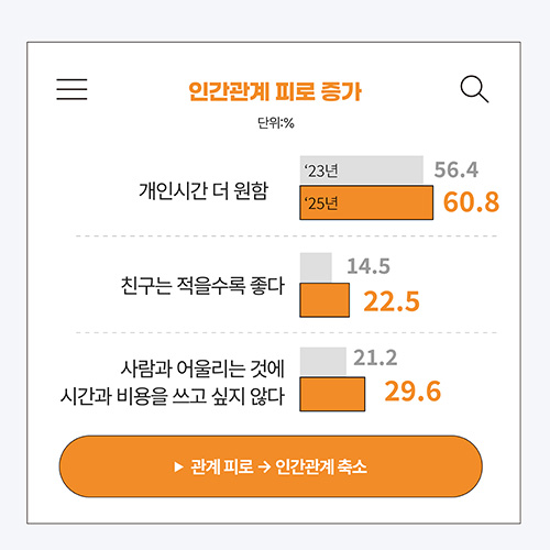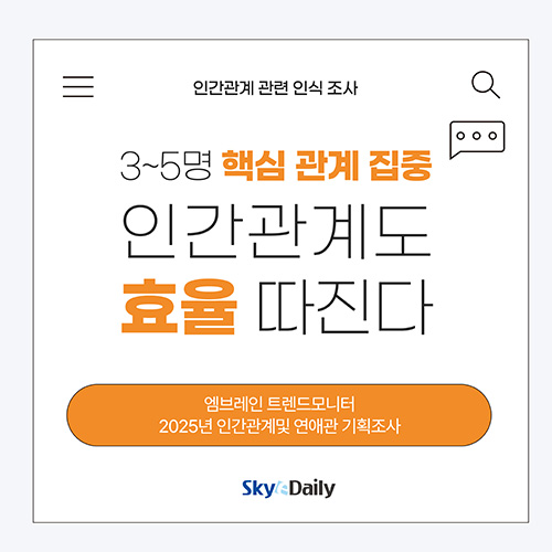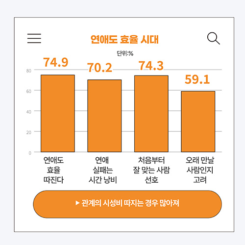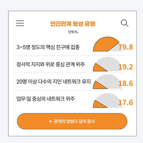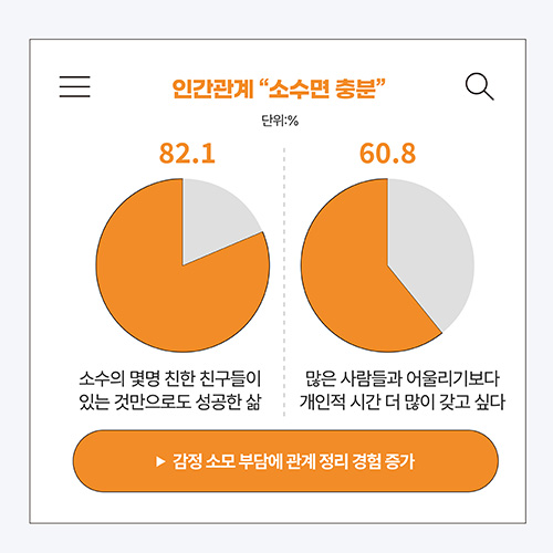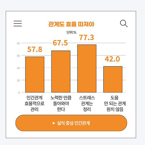 °ü°è¿¡ ´ëÇÑ ÇǷΰ¡ Ä¿Áö¸é¼­ Àΰ£°ü°è¿Í ¿¬¾Ö¿¡¼­µµ ¡®È¿À²¼º¡¯À» Áß½ÃÇÏ´Â °æÇâÀÌ °­ÇØÁö°í ÀÖ´Â °ÍÀ¸·Î ³ªÅ¸³µ´Ù. ½ÃÀåÁ¶»ç±â¾÷ ¿¥ºê·¹ÀÎ Æ®·»µå¸ð´ÏÅͰ¡ Àü±¹ ¼ºÀÎ 1000¸íÀ» ´ë»óÀ¸·Î Á¶»çÇÑ °á°ú ÀÀ´äÀÚÀÇ 82.1%´Â ¡®¼Ò¼öÀÇ Ä£±¸¸¸ À־ ¼º°øÇÑ »î¡¯À̶ó°í ´äÇß°í 79.8%´Â Æò¼Ò 3~5¸íÀÇ ÇÙ½É °ü°è¿¡ ÁýÁßÇÑ´Ù°í ¹àÇû´Ù. Àΰ£°ü°èµµ ³ë·ÂÇÑ ¸¸Å­ µ¹¾Æ¿Í¾ß ÇÑ´Ù´Â ÀÀ´äÀº 67.5%·Î ³ªÅ¸³µÀ¸¸ç ½ºÆ®·¹½º¸¦ ÁÖ´Â °ü°è¸¦ Á¤¸®ÇÑ °æÇèÀÌ ÀÖ´Ù´Â ÀÀ´äµµ 75.0%¿¡ ´ÞÇß´Ù. ¿¬¾Ö¿¡¼­µµ È¿À²¼ºÀ» µûÁö´Â ½Ã´ë¶ó´Â ÀνÄÀÌ 74.9%·Î ³ô°Ô ³ªÅ¸³µ°í Àý¹Ý°¡·®Àº ¸ÅĪ ¼­ºñ½º³ª ±ÃÇÕ¡¤»çÁÖ µîÀ» ÅëÇØ óÀ½ºÎÅÍ Àß ¸Â´Â »ó´ë¸¦ ã°í ½Í´Ù°í ´äÇß´Ù.