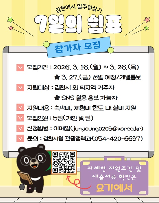 °æ»óºÏµµ ±èõ½Ã°¡ ü·ùÇü °ü±¤ÇÁ·Î±×·¥ ¡®7ÀÏÀÇ ½°Ç¥ in ±èõ¡¯ ¿î¿µÀ» ½ÃÀÛÇϰí 4¿ù Âü°¡ÀÚ ¸ðÁý¿¡ ³ª¼¹´Ù.