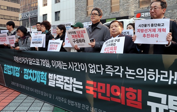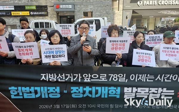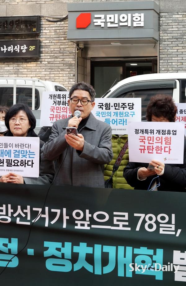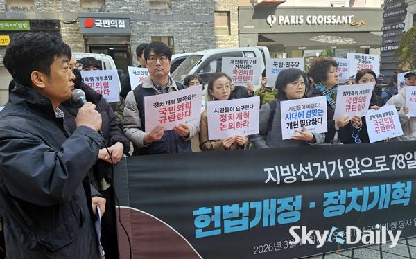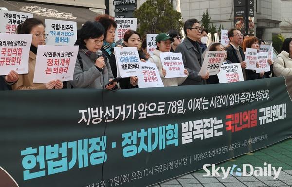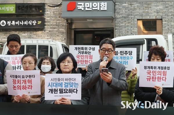 ¡ã ½Ã¹Î»çȸ´Üü¿¬´ëȸÀǰ¡ 17ÀÏ ¿ÀÀü ¼­¿ï ¿©Àǵµ ±¹¹ÎÀÇÈû ´ç»ç ¾Õ¿¡¼­ ±âÀÚȸ°ßÀ» ¿­°í Çå¹ý °³Á¤°ú Á¤Ä¡ °³ÇõÀ» °­·ÂÈ÷ Ã˱¸Çϰí ÀÖ´Ù. Âü°¡ÀÚµéÀº ÇöÀç °ü·Ã ±¹È¸ ³íÀǸ¦ °ÅºÎÇϰí ÀÖ´Â ±¹¹ÎÀÇÈûÀ» ±ÔźÇѵ¥ ÀÌ¾î ´õºÒ¾î¹ÎÁÖ´ç ´ç»ç ¾Õ¿¡¼­µµ ȸ°ßÀ» ¿­°í, °Å´ë ¾ß´çÀ¸·Î¼­ ´õ¿í Ã¥ÀÓ°¨ ÀÖ°í Àû±ØÀûÀÎ ÀÚ¼¼·Î °³Çõ¿¡ ³ª¼³ °ÍÀ» ÁÖ¹®Çß´Ù. ÀÌÁ¾¿ø ±âÀÚ ¨Ï½ºÄ«À̵¥Àϸ®