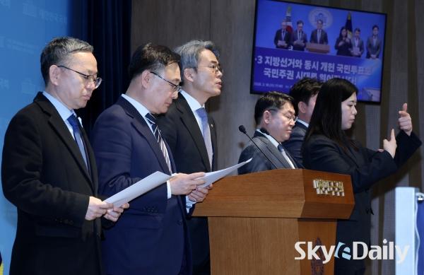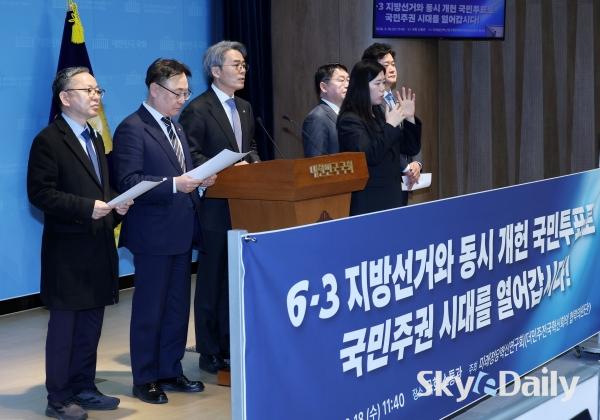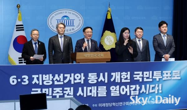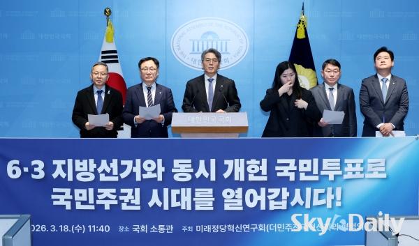¡ã ´õºÒ¾î¹ÎÁÖ´ç À̱¤Èñ ÀÇ¿ø µî ¹Ì·¡Á¤´çÇõ½Å¿¬±¸È¸ ¼Ò¼Ó ÀÇ¿øµéÀÌ 18ÀÏ ¼­¿ï ¿©Àǵµ ±¹È¸ ¼ÒÅë°ü¿¡¼­ °³Çå ±¹¹ÎÅõÇ¥ Ã˱¸ ±âÀÚȸ°ßÀ» Çϰí ÀÖ´Ù. ¹Ú¹Ì³ª ±âÀÚ ¨Ï½ºÄ«À̵¥Àϸ®