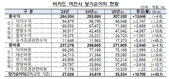 ±ÝÀ¶°¨µ¶¿øÀÌ 19ÀÏ ¹ßÇ¥ÇÑ ¡®2025³â ¿©½ÅÀü¹®±ÝÀ¶È¸»ç ¿µ¾÷½ÇÀû ÀáÁ¤Ä¡¡¯¿¡ µû¸£¸é 8°³ Àü¾÷Ä«µå»çÀÇ ´ç±â¼øÀÌÀÍÀº 2Á¶3602¾ï ¿øÀ¸·Î Àü³âº¸´Ù 2308¾ï ¿ø, 8.9% °¨¼ÒÇß´Ù. °¡¸ÍÁ¡¼ö¼ö·á ¼öÀÍÀÌ ÁÙ¾îµç °¡¿îµ¥ Ä«µå´ëÃâ¼öÀͰú ÇÒºÎÄ«µå¼ö¼ö·á ¼öÀÍÀº ´Ã¾úÁö¸¸, ÀÌÀÚºñ¿ë°ú ´ë¼Õºñ¿ë Áõ°¡ ÆøÀÌ ´õ ÄÇ´Ù.