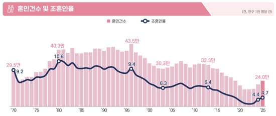 ±¹°¡µ¥ÀÌÅÍó°¡ 19ÀÏ ¹ßÇ¥ÇÑ 2025³â È¥ÀΡ¤ÀÌÈ¥ Åë°è¿¡ µû¸£¸é Áö³ÇØ È¥ÀΰǼö´Â 24¸¸°ÇÀ¸·Î Àü³â´ëºñ 1¸¸8000°Ç(8.1%) ´Ã¾ú°í, ÀÌÈ¥°Ç¼ö´Â 8¸¸8000°ÇÀ¸·Î 3õ°Ç(3.3%) ÁÙ¾ú´Ù.